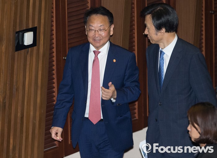 (서울=포커스뉴스) 20일 오후 서울 여의도 국회에서 344회 국회(임시회) 2차 본회의, 사드(THAAD·고고도미사일방어체계) 배치에 대한 긴급현안질문이 산회된 후 유일호(왼쪽) 경제부총리 겸 기획재정부 장관과 윤병세 외교부 장관이 대화하며 퇴장하고 있다.