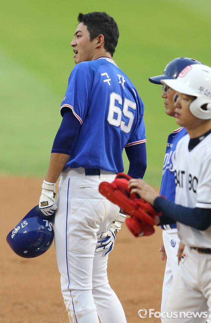 (서울=포커스뉴스) 20일 서울 잠실구장에서 열린 2016 프로야구 삼성-두산 경기 3회초 무사 1루에서 삼성 구자욱이 몸에 맞는 볼로 진루한뒤 1루에서 오른쪽 허벅지를 만지고 있다.