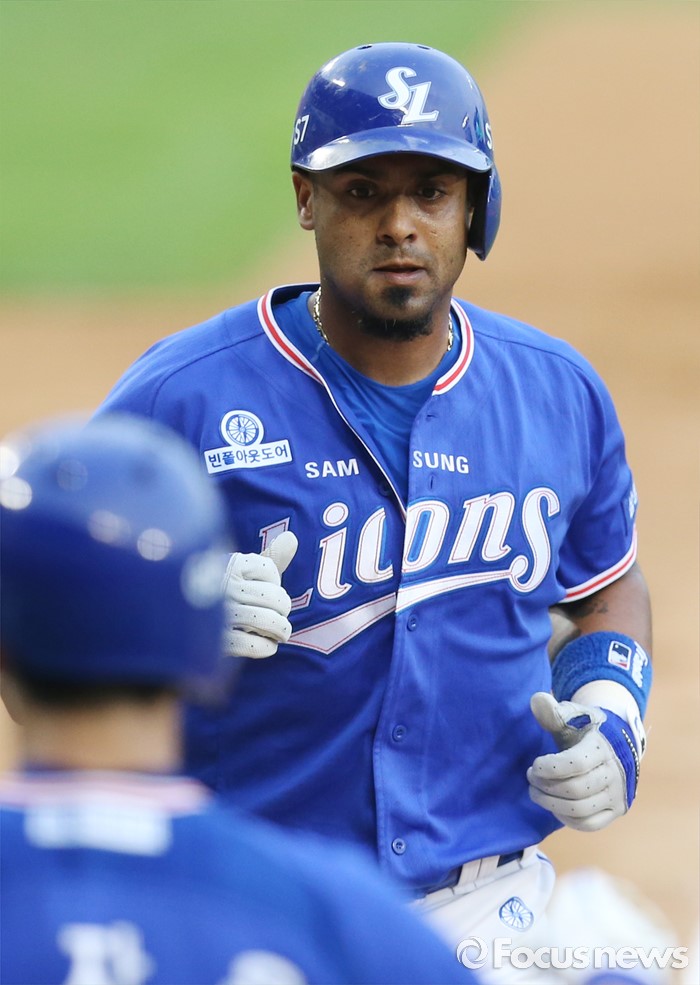 (서울=포커스뉴스) 20일 서울 잠실구장에서 열린 2016 프로야구 삼성-두산 경기 3회초 2사후 삼성 발디리스가 좌월 만루홈런을 치고 선행주자들의 환영을 받으며 홈인하고 있다.