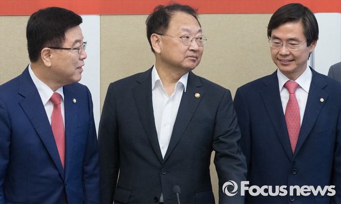 (서울=포커스뉴스) 21일 오전 서울 여의도 국회 귀빈식당에서 열린 2016년 세법개정 당정협의에 참석한 김광림(왼쪽부터) 새누리당 정책위의장, 유일호 경제부총리 겸 기획재정부 장관, 조경태 기획재정위원장이 대화하고 있다.