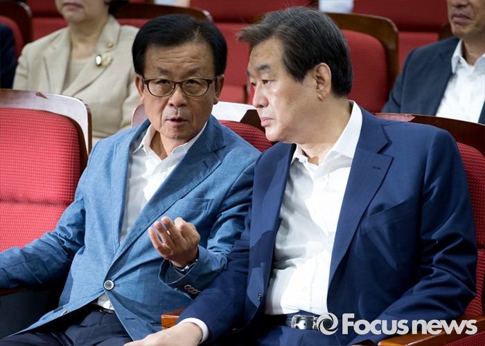 (서울=포커스뉴스) 21일 오전 서울 여의도 국회 의원회관에서 열린 퓨처라이프포럼 2기 출범식 및 세미나에 참석한 김무성(오른쪽) 새누리당 전 대표와 원혜영 더불어민주당 의원이 대화하고 있다.