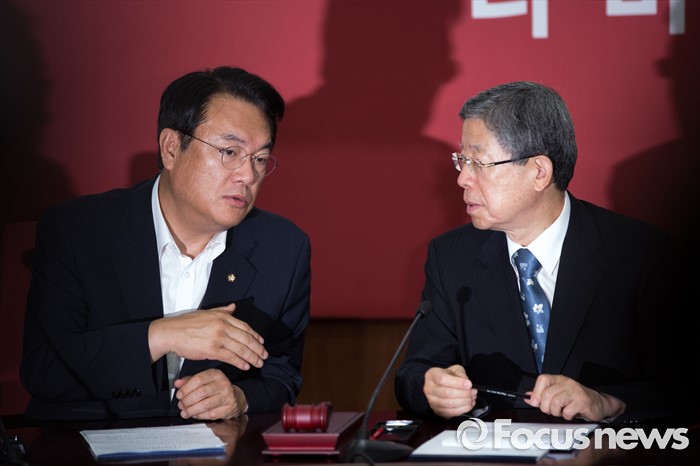 (서울=포커스뉴스) 김희옥(오른쪽) 새누리당 혁신비상대책위원장과 정진석원내대표가 21일 오전 서울 여의도 새누리당사에서 열린 혁신비상대책위원회의에 참석하고 있다.