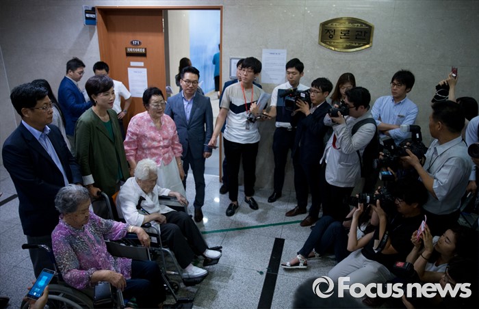 (서울=포커스뉴스) 21일 오전 서울 여의도 국회 정론관에서 유은혜 더불어민주당 의원, 최성 고양시장, 이용수, 박옥선, 이옥선 할머니 등이 위안부 특별법 입법 청원 기자회견을 마친 뒤 취재진 질문에 답하고 있다.