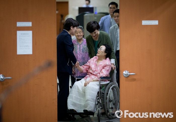 (서울=포커스뉴스) 21일 오전 서울 여의도 국회 정론관 앞에서 위안부 특별법 입법 청원 기자회견에 나서는 유은혜 더불어민주당 의원, 이용수, 박옥선, 이옥선 할머니와 강은희 여성가족부 장관이 인사하고 있다.