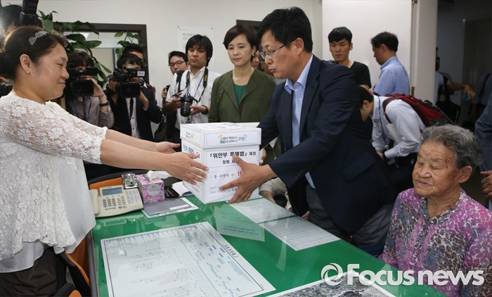 (서울=포커스뉴스) 21일 오전 서울 여의도 국회 정론관에서 유은혜 더불어민주당 의원, 최성 고양시장, 이용수, 박옥선, 이옥선 할머니 등이 위안부 특별법 입법 청원 기자회견을 마친 뒤 민원실을 찾아 청원서를 제출하고 있다.
