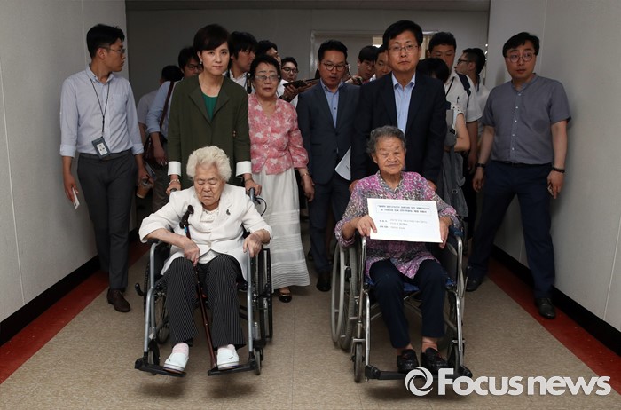(서울=포커스뉴스) 21일 오전 서울 여의도 국회 정론관에서 유은혜 더불어민주당 의원, 최성 고양시장, 이용수, 박옥선, 이옥선 할머니 등이 위안부 특별법 입법 청원 기자회견을 마친 뒤 청원서를 제출하기 위해 민원실로 향하고 있다.