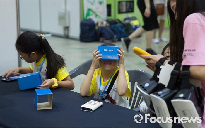 (서울=포커스뉴스) 21일 오전 서울 강남구 코엑스에서 열린 '2016 청소년 발명 페스티벌'에 참여한 학생들이 종이로 만들수 있는 VR 박스를 만들고 있다.