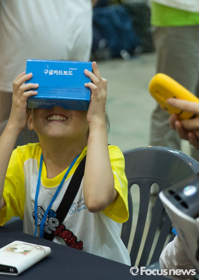 (서울=포커스뉴스) 21일 오전 서울 강남구 코엑스에서 열린 '2016 청소년 발명 페스티벌'에 참여한 한 학생이 종이로 만들수 있는 VR 박스를 체험하고 있다.