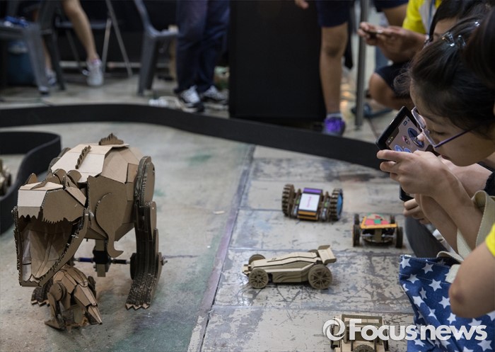 (서울=포커스뉴스) 21일 오전 서울 강남구 코엑스에서 열린 '2016 청소년 발명 페스티벌' 에 참여한 학생들이 스마트폰을 이용해 무선 장난감을 조작하고 있다.