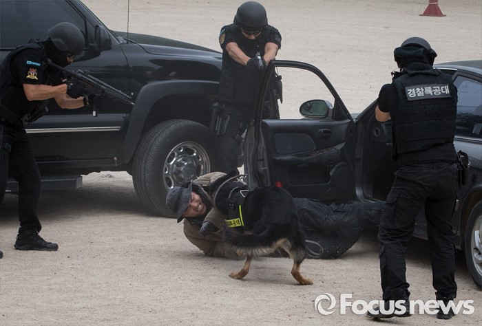 (서울=포커스뉴스) 21일 오전 서울 서초구 경찰특공대에서 경찰 특공대원들이 대테러 훈련을 하고 있다.