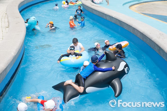 (서울=포커스뉴스) 21일 오후 서울 광진구 뚝섬 한강공원 수영장을 찾은 어린이들 물놀이를 즐기고 있다.