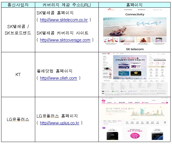 통신서비스 커버리지 정보는 이용자가 쉽게 이해하고 찾아볼 수 있도록 지도를 활용한 커버리지맵(Coverage Map) 형태로 제공된다.커버리지맵은 전국을 가로 75mx세로 75m의 면적 단위로 구분해 LTE, 3G, 와이파이(WiFi), 초고속인터넷 서비스의 이용가능 정보를 제공한다. LTE 서비스는 3밴드 LTE-A 제공 지역을 포함한 최소 3단계 이상으로 구분해 표시한다.