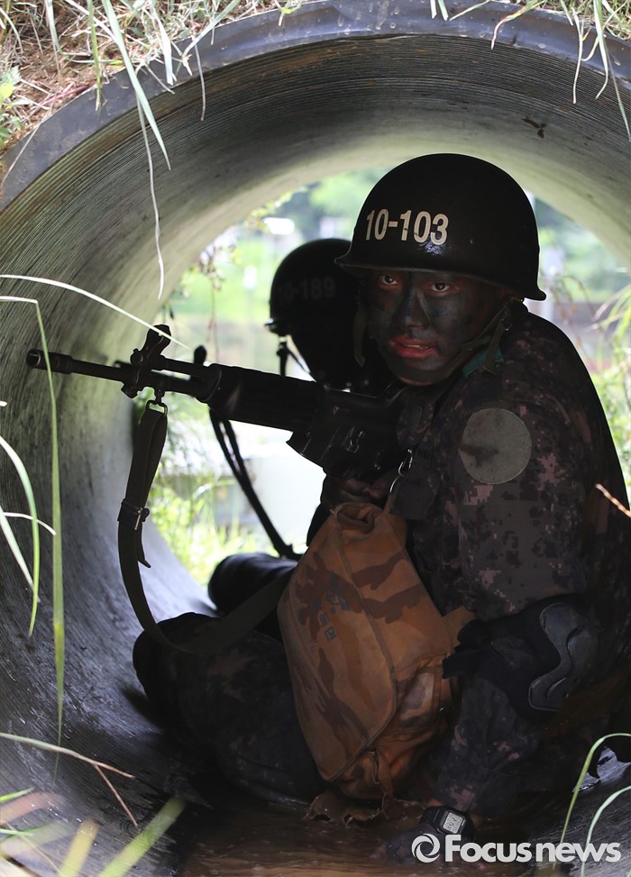 (논산=포커스뉴스) 폭염경보가 발령된 21일 충남 논산 연무읍 육군훈련소 각개전투종합훈련장에서 26교육연대 3교육대 훈련병이 훈련을 받고 있다.