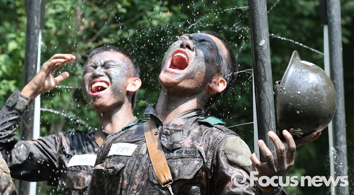 (논산=포커스뉴스) 폭염경보가 발령된 21일 충남 논산 연무읍 육군훈련소 각계전투종합훈련장에서 26교육연대 3교육대 훈련병들이 훈련을 받고 샤워를 하며 더위를 식히고 있다.