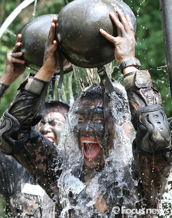 (논산=포커스뉴스) 폭염경보가 발령된 21일 충남 논산 연무읍 육군훈련소 각계전투종합훈련장에서 26교육연대 3교육대 훈련병들이 훈련을 받고 샤워를 하며 더위를 식히고 있다.