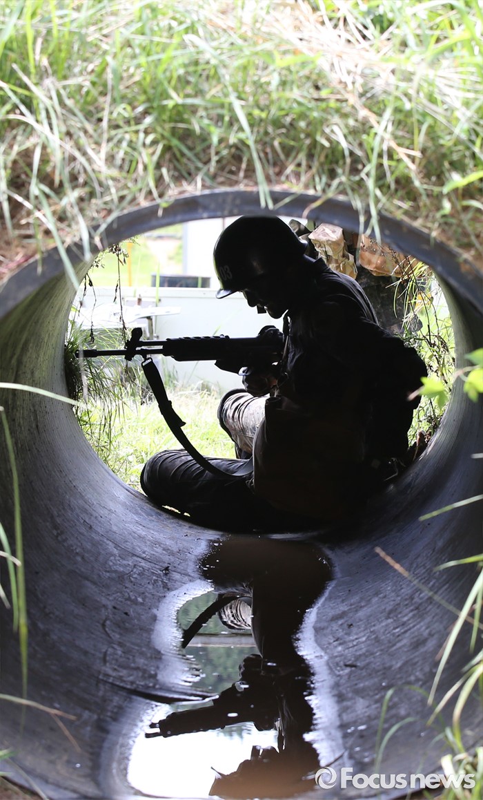 (논산=포커스뉴스) 폭염경보가 발령된 21일 충남 논산 연무읍 육군훈련소 각개전투종합훈련장에서 26교육연대 3교육대 훈련병이 훈련을 받고 있다.