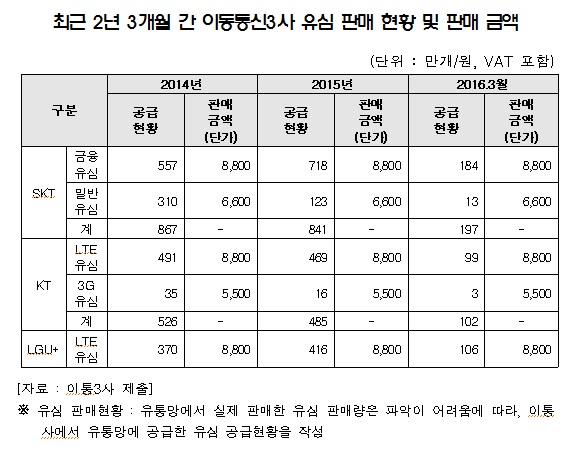 ICT소비자정책연구원이 미래창조과학부와 이동통신 3사로부터 제공받은 최근 2년 3개월간의 스마트폰 유심 판매현황은 3910만개에 달했다. 이통 3사는 LTE 유심 기준 8800원에 대리점과 판매점에 유통하며, 대리점과 판매점에서는 납품받은 가격 그대로 소비자에게 판매하는 구조로 이뤄져 있다.