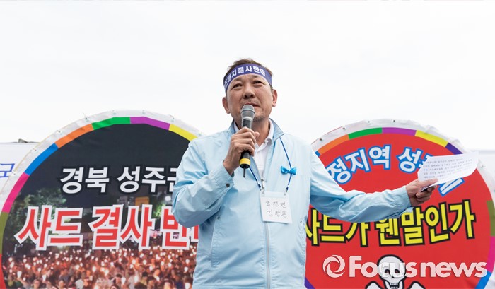(서울=포커스뉴스) 21일 오후 서울역 광장에서 사드 배치 반대를 요구하는 김항곤 성주군수가 발언을 하고 있다.