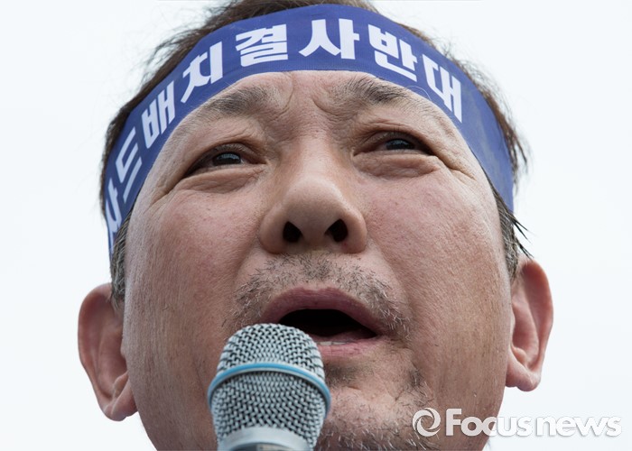 (서울=포커스뉴스) 21일 오후 서울역 광장에서 사드 배치 반대를 요구하는 김항곤 성주군수가 발언을 하고 있다.