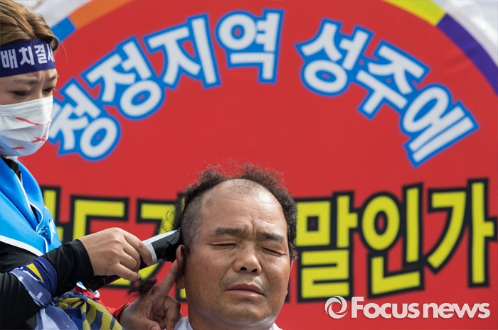 (서울=포커스뉴스) 21일 오후 서울역 광장에서 사드 배치 반대를 요구하는 배재만 성주군의장이 상경집회에 참가해 삭발식을 하고 있다.
