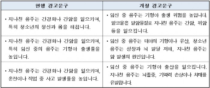 이번 행정예고안은 주류용기에 임신중 음주는 태아의 건강을 해칠 수 있다는 내용의 경고문구를 표기하도록 의무화하는 개정 ‘국민건강증진법’을 시행하기 위한 것으로, 기존 경고문구(3가지)에 임신 중 음주 경고(기형아 출산 등) 내용을 포함시키고, 기존 경고문구를 보완한 내용을 개정안에 담고 있다.
