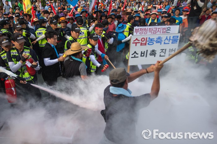 (서울=포커스뉴스) 21일 오후 서울 여의도 산업은행 본점 앞에서 농축산물의 김영란법 적용 제외를 요구하는 전국 농축산인 총궐기대회가 열린 가운데 수입농축산물 모형에 불을 붙이는 퍼포먼스가 진행되자 경찰병력이 급히 진화에 나서고 있다.