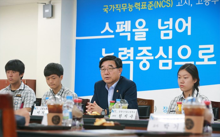 (성남=포커스뉴스) 이기권 고용노동부 장관이 21일 경기 성남시 분당구 양영디지털고를 방문해 학생(재·졸업), 기업, 교사와 NCS에 따른 현장의 변화에 대한 의견을 나누고 있다. <사진제공=고용노동부>