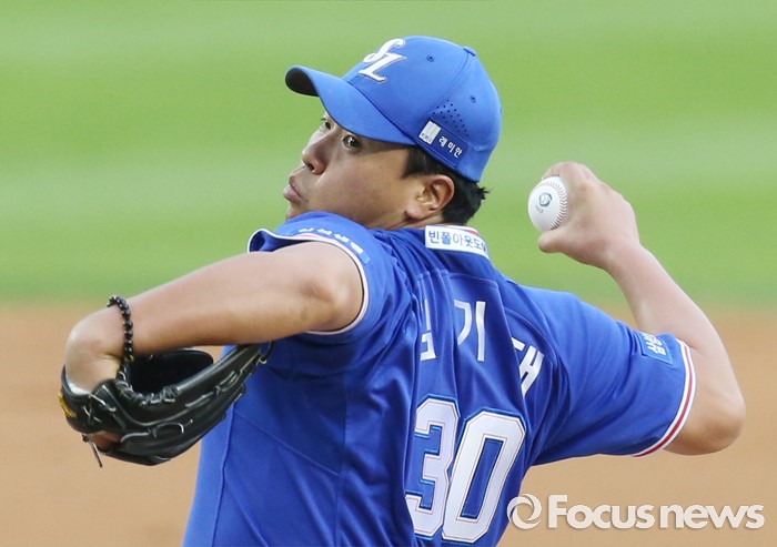 (서울=포커스뉴스) 21일 서울 잠실구장에서 열린 2016 프로야구 삼성-두산 경기에서 1회말 삼성 선발투수 김기태가 투구하고 있다.