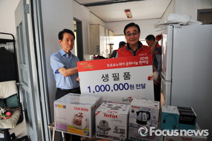 한편 이날 마사회는 의정부시희망회복지원센터, 행복나눔센터 등 의정부지역 7개 단체에 총 5700만원의 기부금을 전달키도 했다.한국마사회는 21일 의정부 문화공감센터에서 주민 700여명의 참여 속에 '2016년 프로보노데이 문화나눔 한마당' 행사를 성공적으로 마쳤다. 사진은 현명관 한국마사회장이 사회 취약층에게 생필품 1000만원 상당을 전달하는 모습. <사진제공=한국마사회>