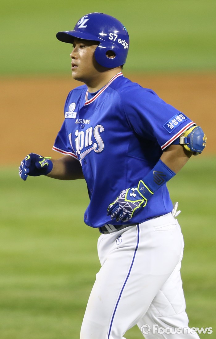 (서울=포커스뉴스) 21일 서울 잠실구장에서 열린 2016 프로야구 삼성-두산 경기 4회초 1사 3루에서 삼성 이지영이 중견수 희생플라이를 치고 더그아웃으로 들어가고 있다.