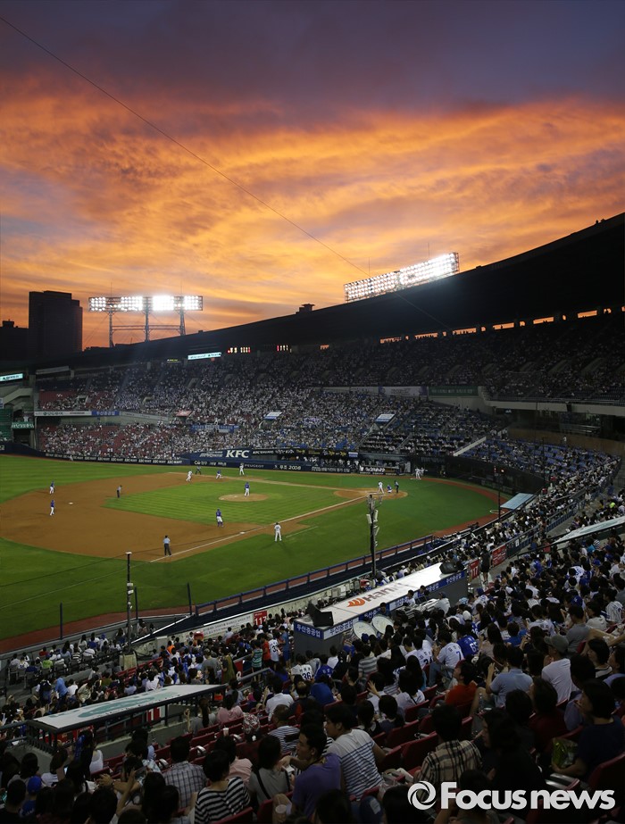 (서울=포커스뉴스) 21일 2016 프로야구 삼성-두산 경기가 열린 서울 잠실구장을 덮은 빨간 노을이 박진감 있는 경기와 더불어 또 하나의 아름다움을 관중들에게 선사하고 있다.