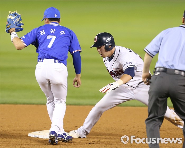 (서울=포커스뉴스) 21일 서울 잠실구장에서 열린 2016 프로야구 삼성-두산 경기 9회말 무사 1루에서 두산 김재환의 1루 땅볼때 1루주자 박건우가 2루에서 아웃되고 있다.