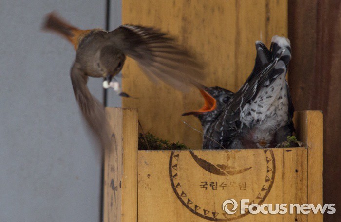 (포천=포커스뉴스) 딱새 암컷이 뻐꾸기(오른쪽)가배설한 똥을 멀리 치우기 위해 물고 나가고 있다. 이 딱새는 자신의 새끼를 죽인 뻐꾸기 새끼를 자신의 자식으로 착각, 부양하고 있다.