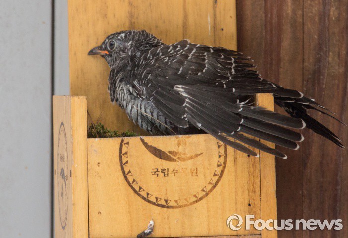 (포천=포커스뉴스) 경기도 포천시 소홀읍 국립수목원 광릉숲 동물관리사 우편함에서 21일 뻐꾸기 새끼가 날아가기 위해 날개를 펴고 있다. 대리모 딱새에게 양육된뻐꾸기 새끼는 딱새 어미 보다 2.5나 자라 독립을 앞두고 있다.