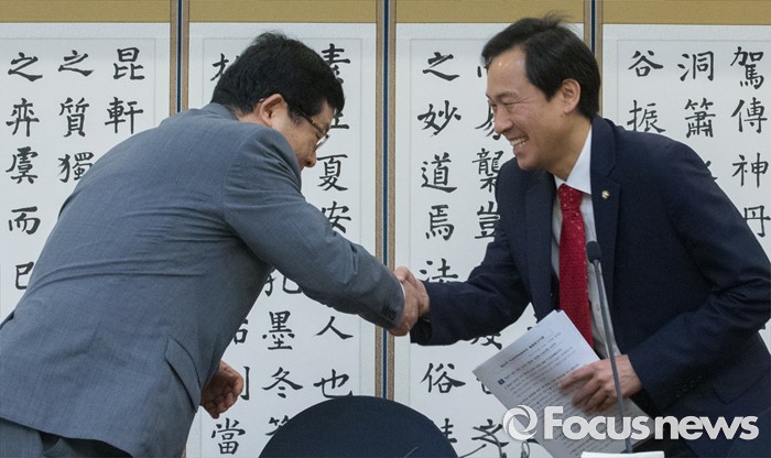 (서울=포커스뉴스) 22일 오전 서울 여의도 국회 귀빈식당에서 열린 한반도 경제·문화포럼 창립총회에 참석한 우상호(오른쪽) 더불어민주당 원내대표와 설훈 의원이 인사하고 있다.