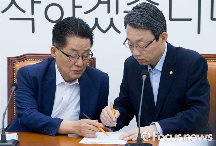 (서울=포커스뉴스) 22일 오전 서울 여의도 국회에서 열린 국민의당 비상대책위원회의에 참석한 박지원(왼쪽) 비상대책위원장과 김성식 정책위의장이 대화하고 있다.