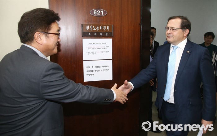 (서울=포커스뉴스) 22일 오전 서울 여의도 국회 환경노동위원회 소회의실에서 우원식 가습기살균제피해 국조특위 위원장과 찰스 헤이 주한 영국대사가 면담에 앞서 악수 하고 있다. 이날 면담은 가습기 살균제 피해자에 대한 영국 옥시사의 진정한 사과 및 관련자의 청문회 출석 요구에 관한 입장 전달 등을 위해 마련됐으며, 우원식 위원장을 비롯한 김상훈 새누리당 간사, 홍익표 더불어민주당 간사, 송기석 국민의당 간사, 이정미 정의당 의원 등이 참석했다.