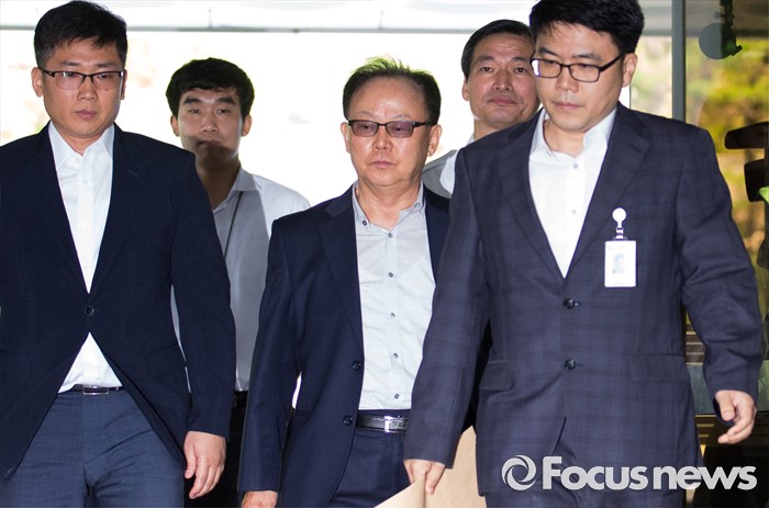 (서울=포커스뉴스) 롯데케미칼의 270억원대 조세포탈 혐의를 받고 있는 기준(가운데) 전 롯데물산 사장이 영장실질심사를 받기 위해 10일 오전 서울중앙지법으로 들어서고 있다.