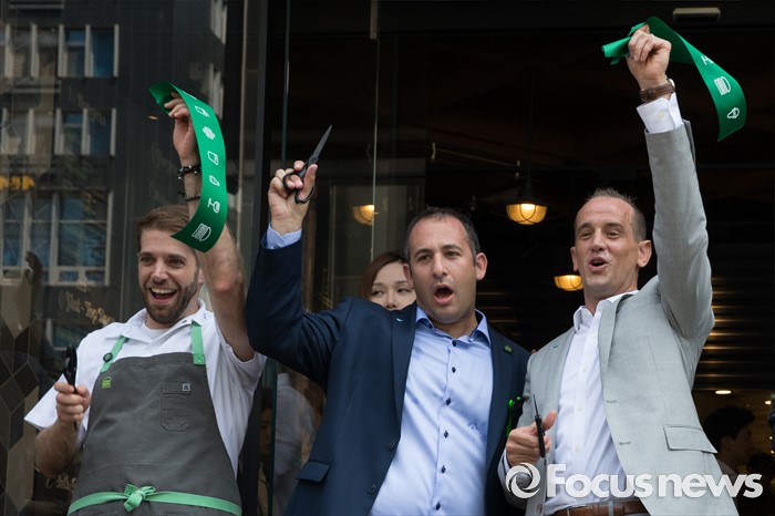 (서울=포커스뉴스) 22일 오전 서울 강남구 쉐이크쉑 국내 1호점 매장 오픈 행사에서 랜디 가루티 쉐이크쉑 CEO를 비롯한 관계자들이 기념촬영을 하고 있다. 왼쪽부터 마크 로사티 컬리너리 디렉터, 마이클 콱 글로벌 사업 부장, 랜디 가루티 CEO.