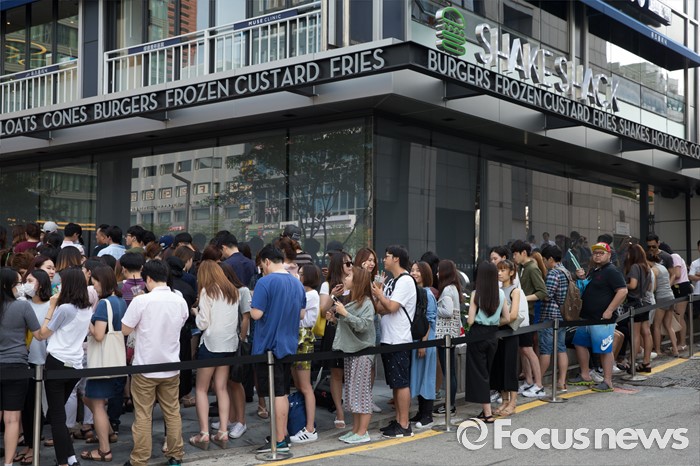 (서울=포커스뉴스) 22일 오전 서울 강남구 쉐이크쉑 국내 1호점 매장 앞에 시민들이 오픈을 앞두고 줄을 서고 있다.