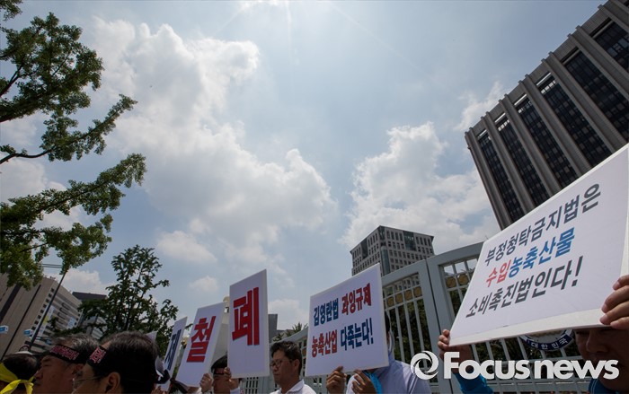 (서울=포커스뉴스) 22일 오후 서울정부청사 앞에서 열린 과잉규제 철폐촉구 농수축산인 기자회견에 참석한 한국농축산연합회 회원들이 김영란법을 반대하는 손팻말을 들고 있다.