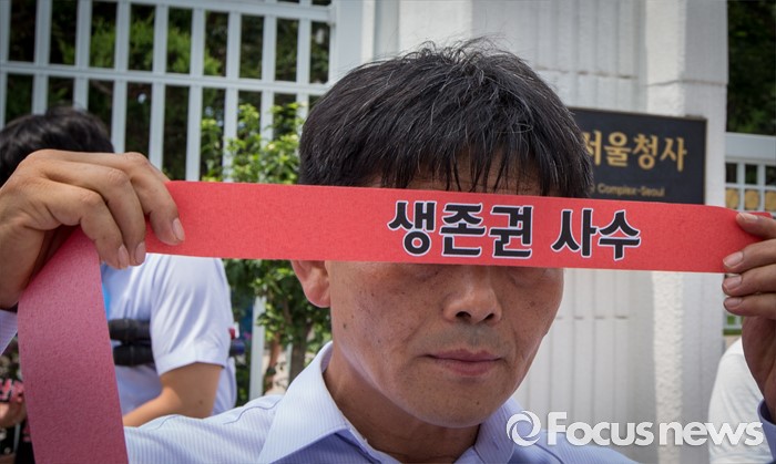 (서울=포커스뉴스) 22일 오후 서울정부청사 앞에서 열린 과잉규제 철폐촉구 농수축산인 기자회견에 참석한 한국농축산연합회 회원들이 머리띠를 두르고 있다.