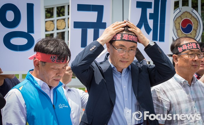 (서울=포커스뉴스) 22일 오후 서울정부청사 앞에서 열린 과잉규제 철폐촉구 농수축산인 기자회견에 참석한 한국농축산연합회 회원들이 머리띠를 두르고 있다.