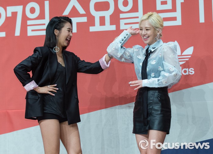 (서울=포커스뉴스) 22일 오후 서울 영등포구 63스퀘어에서 열린 Mnet '힛 더 스테이지' 제작발표회에 참석한 가수 보라(왼쪽)와 효연이 포토타임을 갖고 있다,