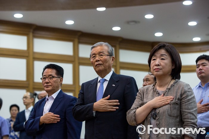 (서울=포커스뉴스) 야3당 대표가 22일 오후 서울 여의도 국회의원회관에서 열린 '5.18 왜곡 방지와 관련 법안 개정(처별규정) 위한 국민 토론회'에 참석해 국민의례 하고 있다. 왼쪽부터 박지원 국민의당 비상대책위원장, 김종인 더불어민주당 비상대책위 대표, 심상정 정의당 상임대표.