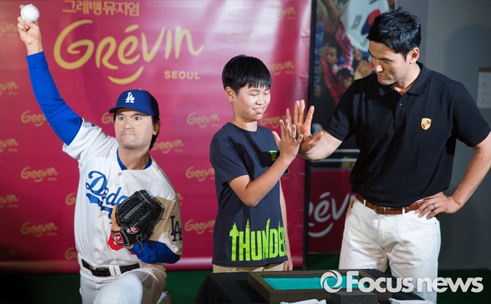 (서울=포커스뉴스) 22일 오후 서울 중구 그레뱅 뮤지엄에서 열린 '그레뱅 뮤지엄 개관 1주년 특별 강연'에 참석한 전 야구선수 박찬호(오른쪽) 한 어린이와 핸드프린팅을 하고 있다.