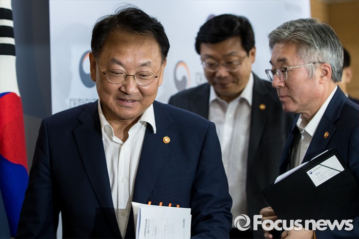 (서울=포커스뉴스) 22일 오후 서울정부청사에서 열린 2016년 추경예산안 합동브리핑에 참석한 유일호(맨 왼쪽) 경제부총리 겸 기획재정부 장관이 발표를 마친 후 발걸음을 옮기고 있다.