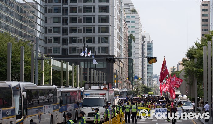 (서울=포커스뉴스) 금속노조 삼성전자서비스지회 조합원들이 22일 오후 서울 서초구 삼성 서초사옥 앞에서 삼성가 3대 세습을 비판하며 거리행진 하고 있다.