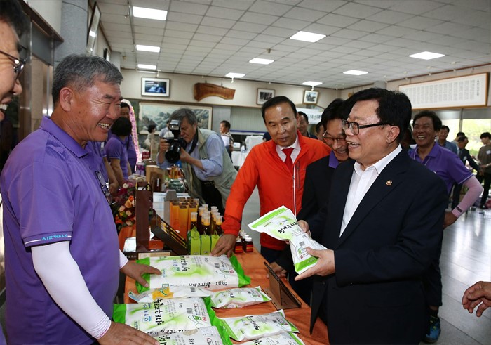 (옥천=포커스뉴스) 이동필 농림축산식품부 장관이 22일 충북 옥천군에서 개최된 '신지식농업인대회'에 참석해 신지식인이 생산한 농산물을 둘러보고 있다. <사진제공=농림축산식품부>