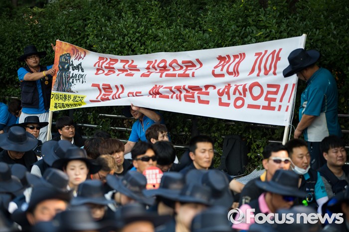 (서울=포커스뉴스) 정부의 일방적인 조선업 구조조정 중단과 현대차 그룹의 성실한 그룹사 공동교섭 참여, 정부의 노동개악 철회등을 내걸며 파업에 들어간 전국금속노조가 22일 오후 서울 서초구 현대자동차 본사 앞에서 금속노조 총파업 대회를 열고 있다.